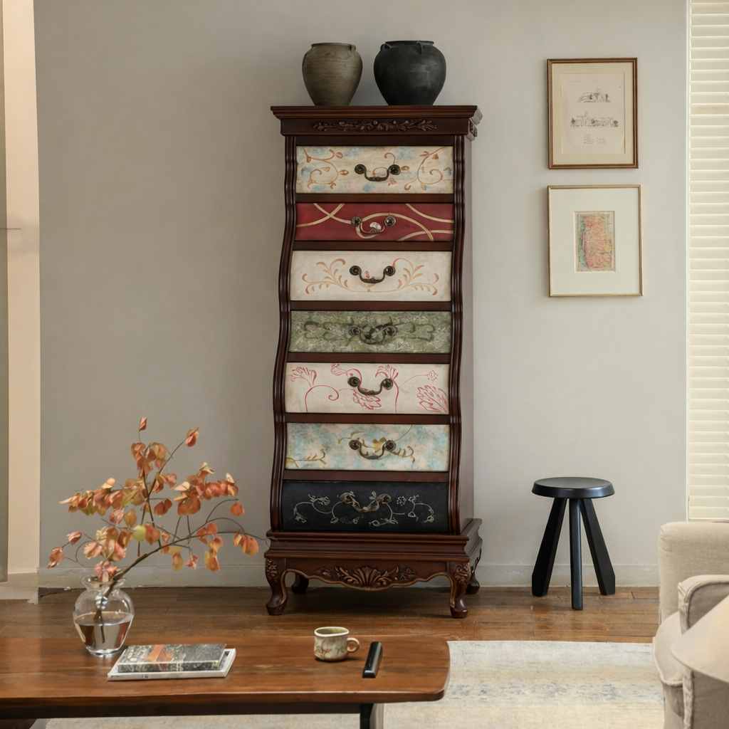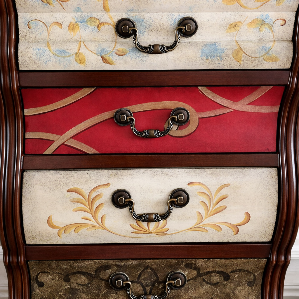 Bring a vintage-inspired statement to your space with this Traditional Wooden Accent Chest With Painted Drawer Fronts For Living Room. Its tall, sculpted silhouette and decorative multicolor drawer panels create an eye-catching storage piece that adds character while keeping your living area organized.