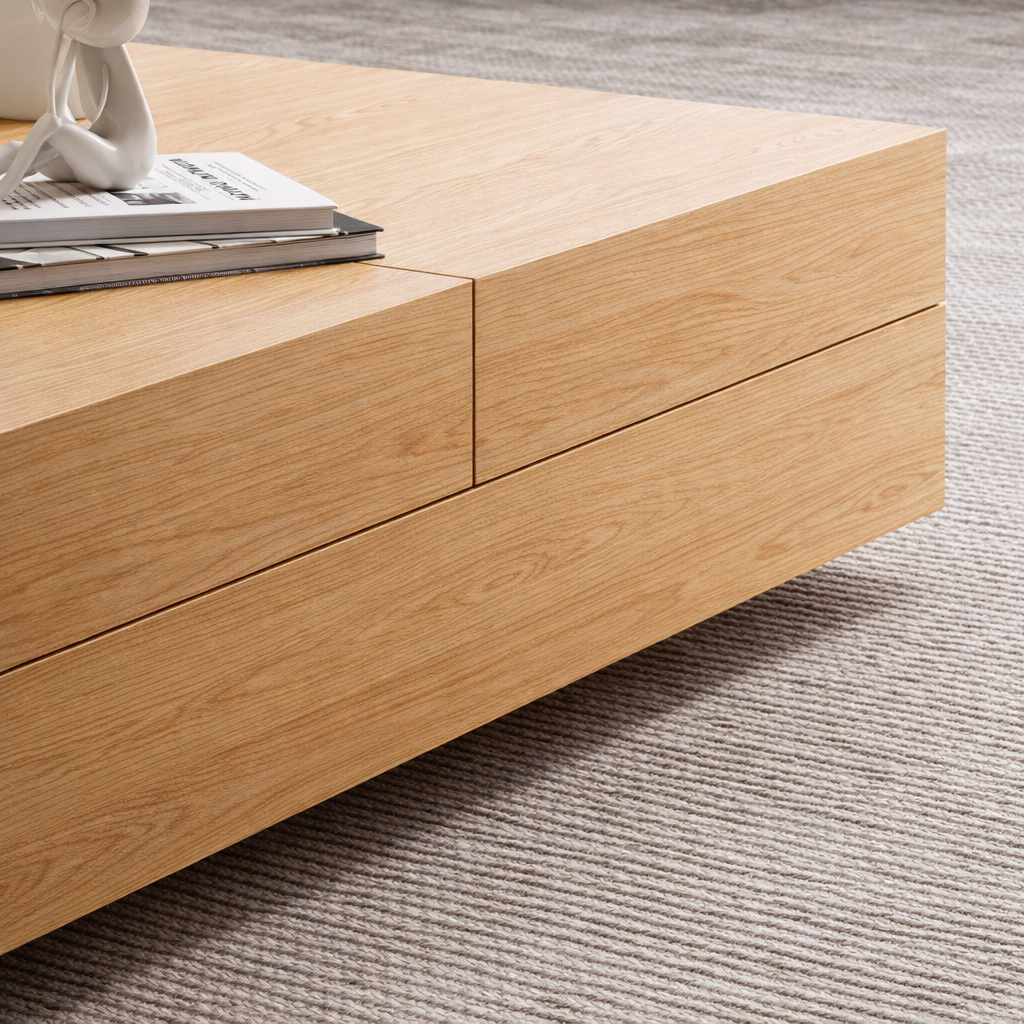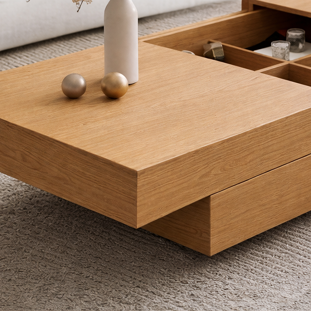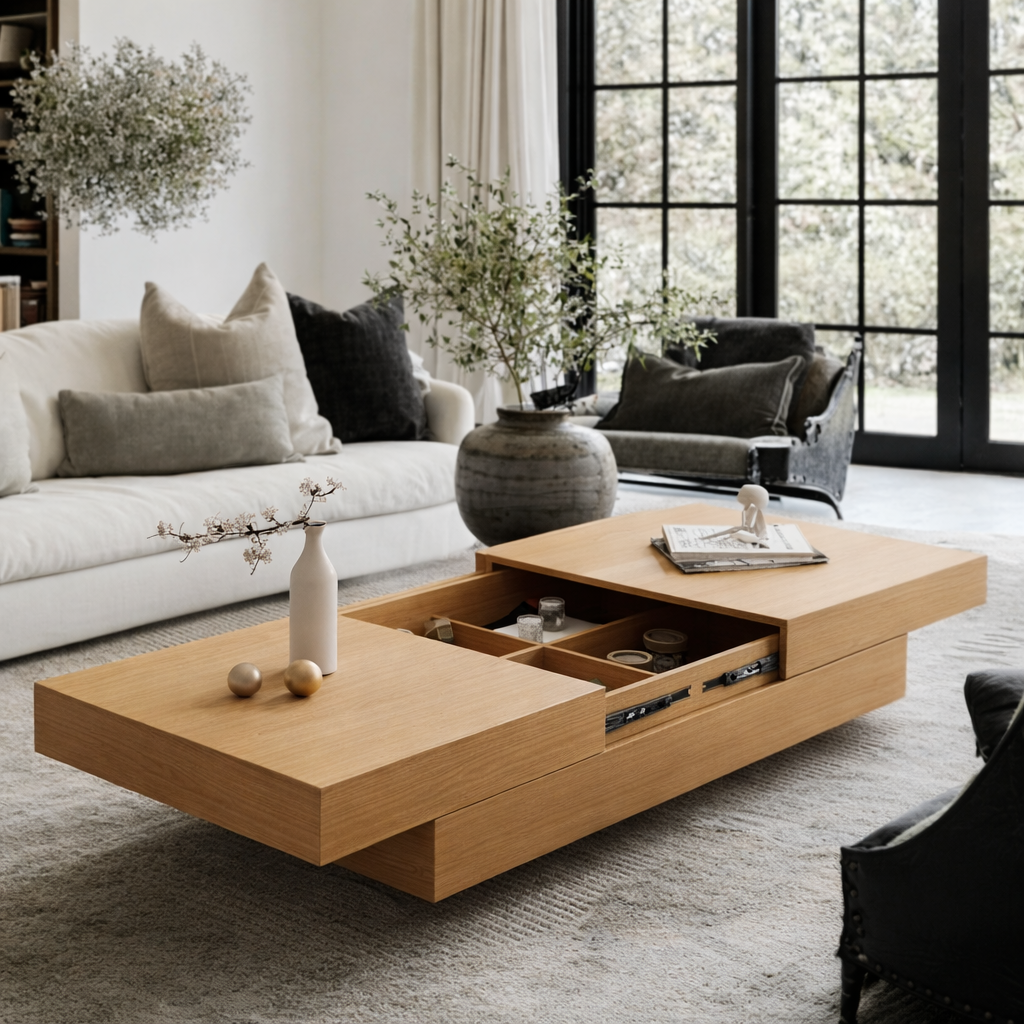 A sleek rectangular profile sits on a streamlined base for a grounded, contemporary look. The tabletop slides open to access divided storage—ideal for remotes, coasters, candles, books, and small accessories—so your living room stays tidy without extra baskets or bins.