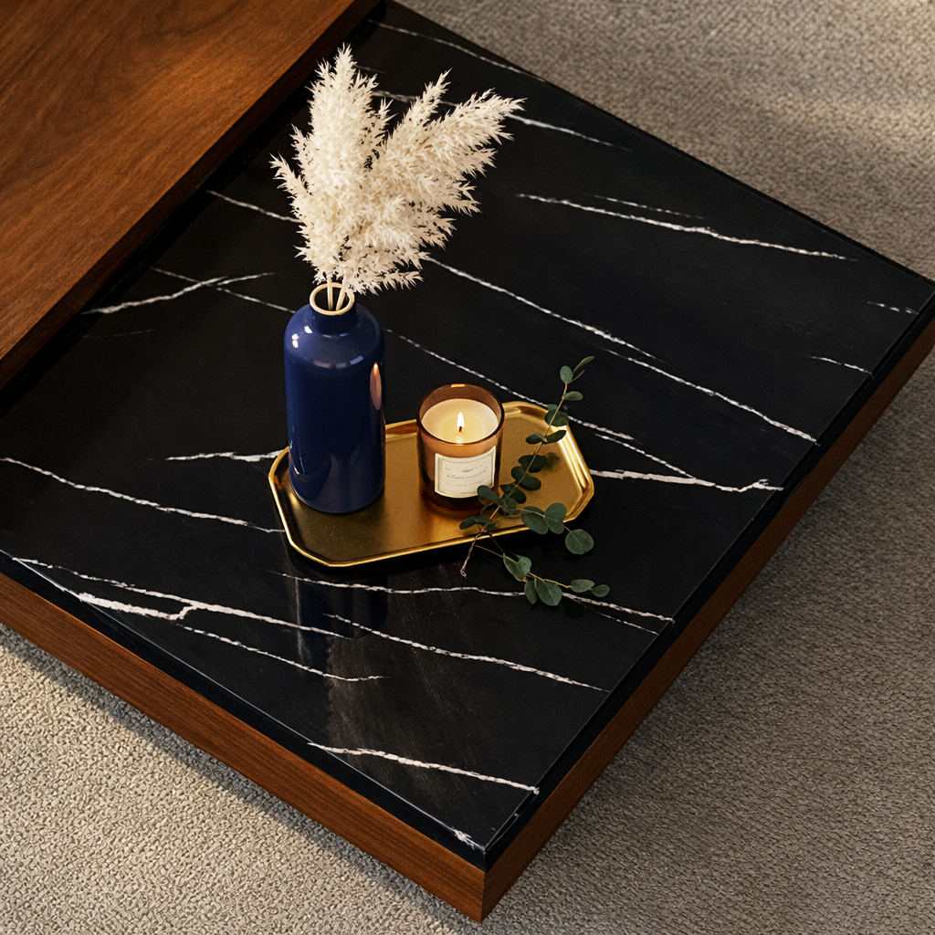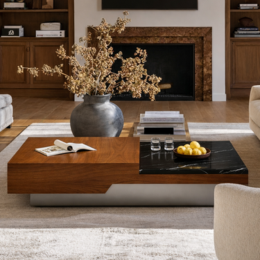 This coffee table features a wide rectangular top with a smooth wood surface paired with an inset stone-look panel for visual contrast and easy styling. The base is a sleek, recessed plinth that gives the piece a floating effect while keeping the overall profile grounded and contemporary. Clean edges and generous scale make it ideal for anchoring larger seating arrangements.