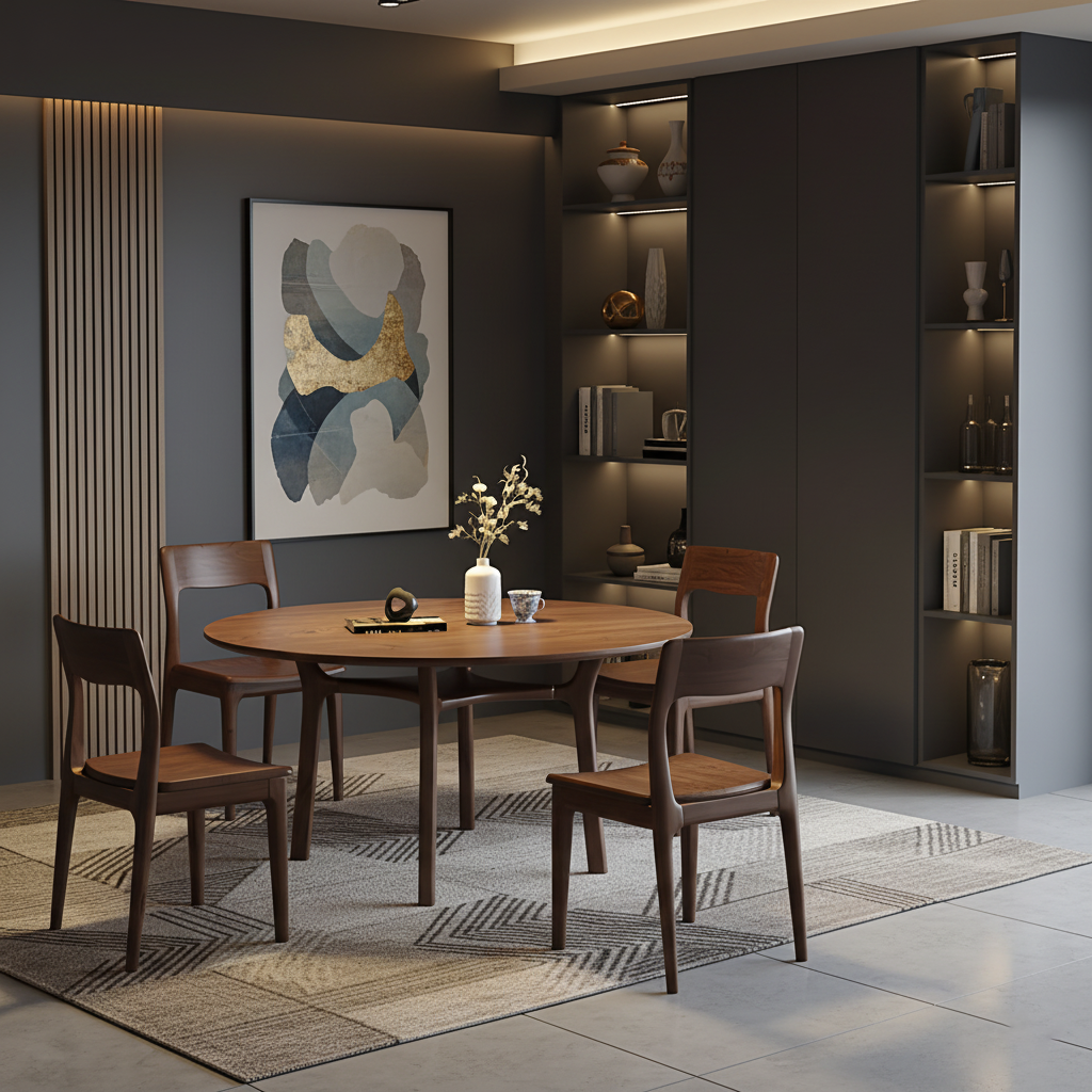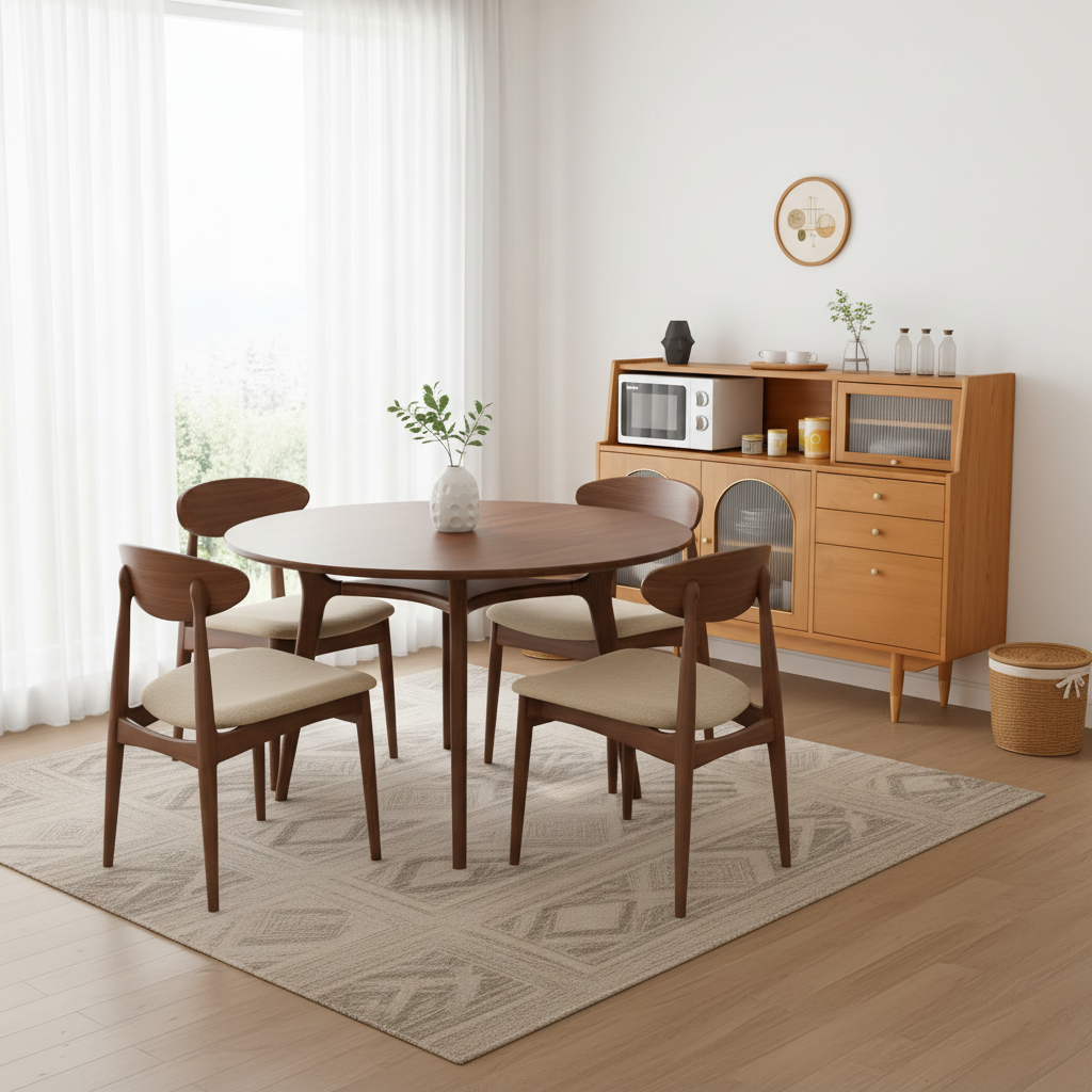 Style it with a neutral runner, a small vase, and warm lighting to complete a calm, curated dining look.