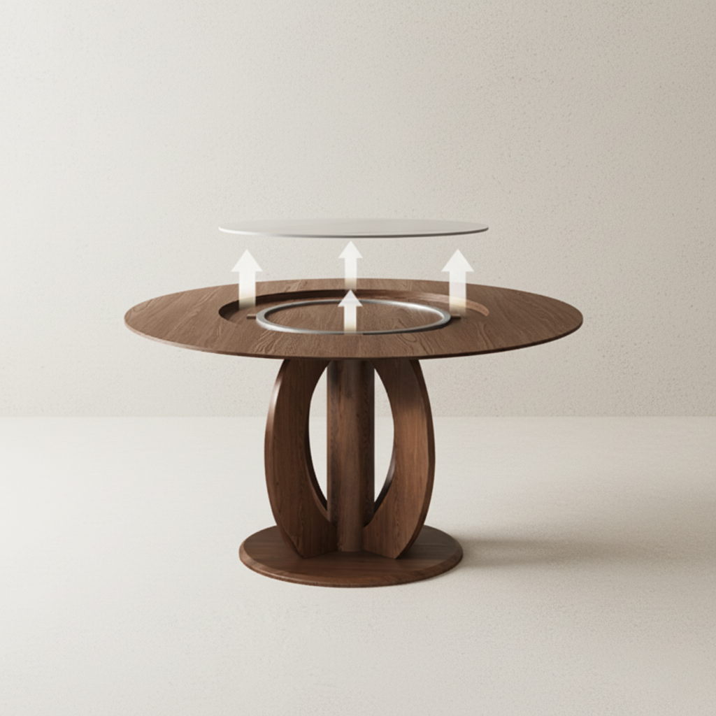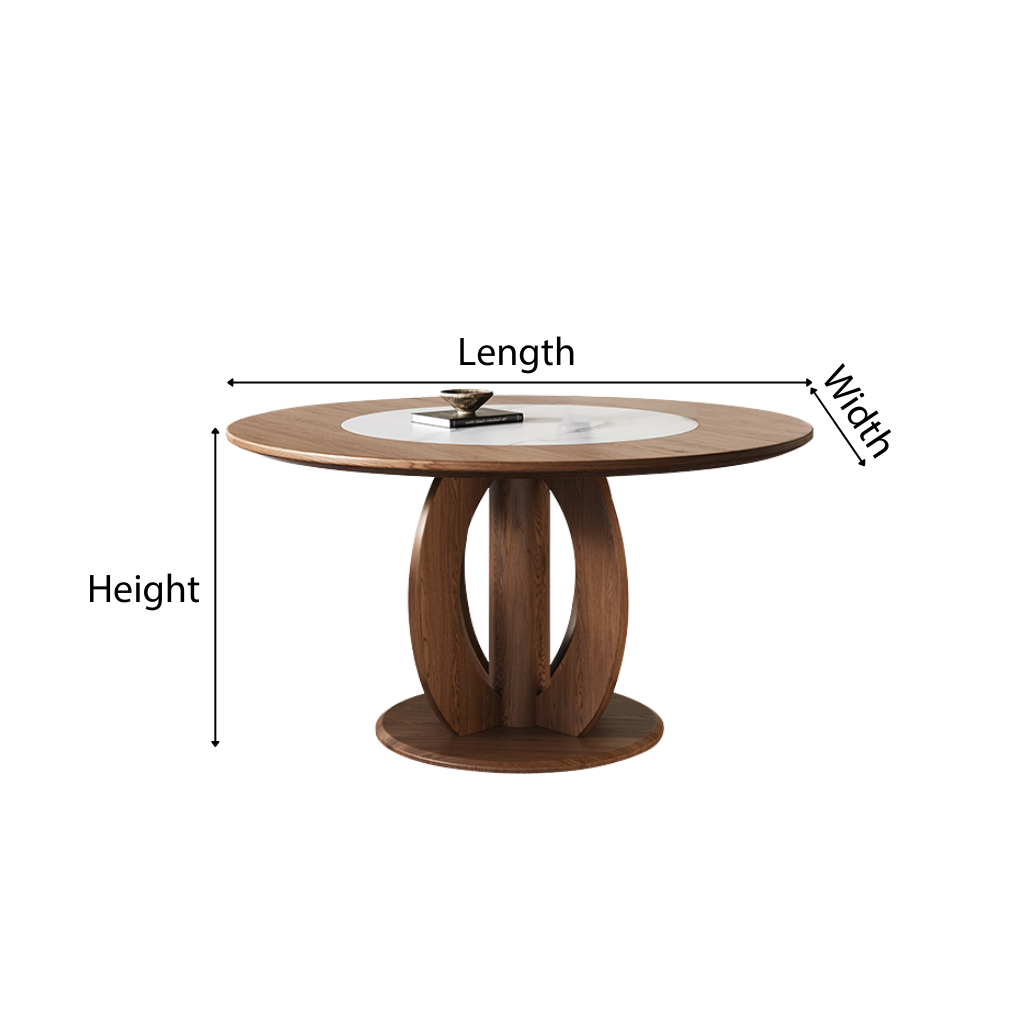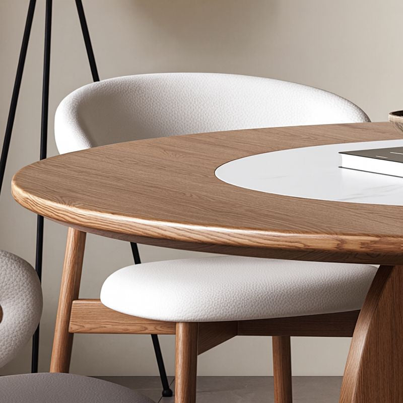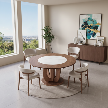 This dining table features a round tabletop with a light-toned center panel that creates a simple contrast against the surrounding wood finish. The smooth edge profile keeps the look modern and comfortable for everyday use.