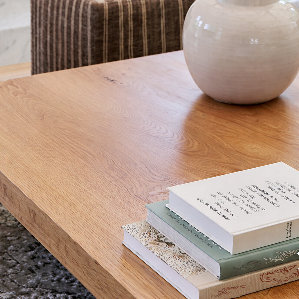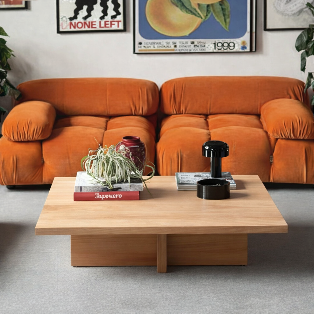 This coffee table features a streamlined rectangular top in a warm wood tone with a low-profile stance that feels grounded and contemporary. A solid plinth-style base adds visual weight and stability, with a centered vertical support detail that brings subtle structure without overwhelming the room. The simple geometry pairs naturally with modern, minimalist, and transitional interiors.