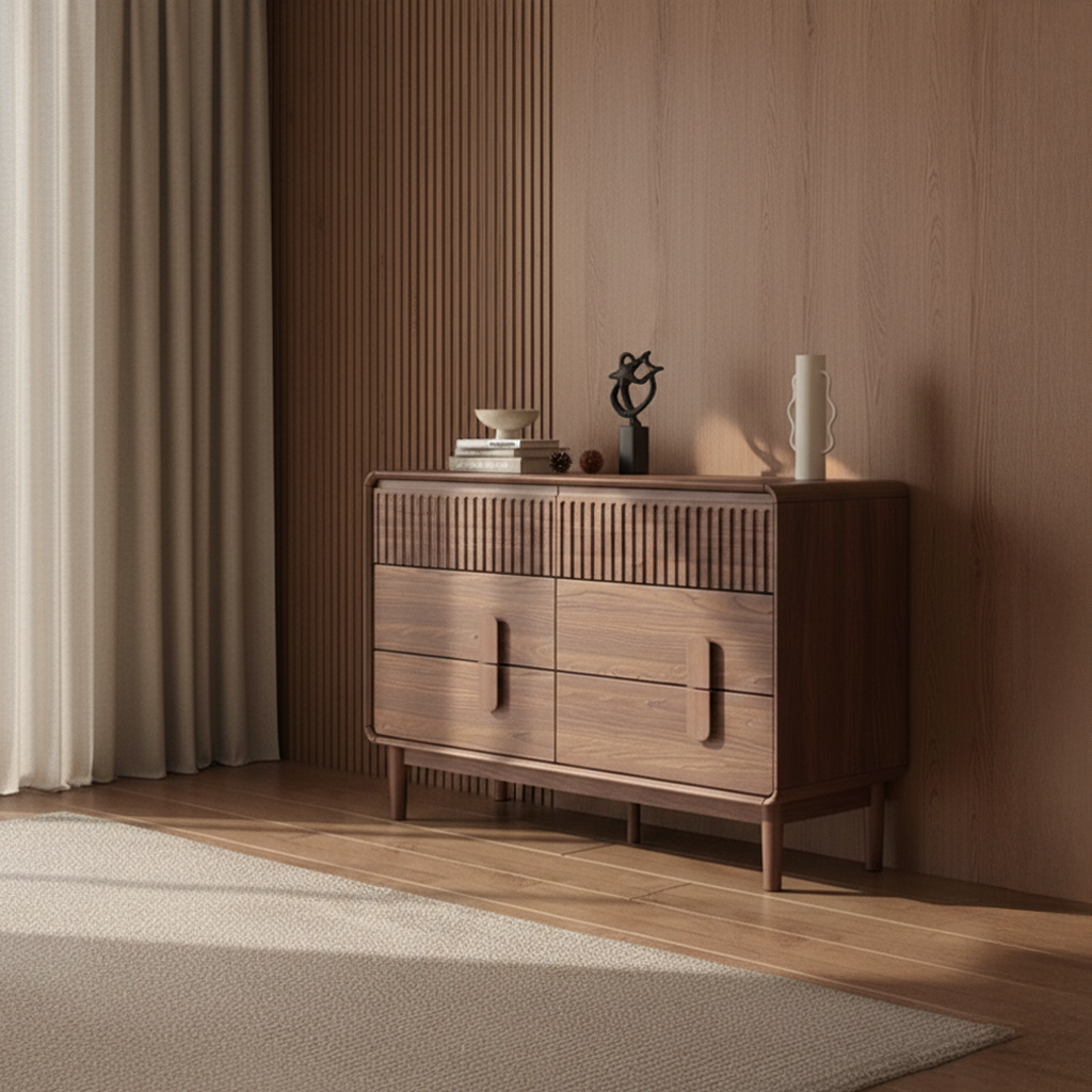 Bring refined warmth and modern mid-century character into your bedroom with this wooden dresser with a fluted top panel, designed with softly rounded edges, an eye-catching fluted upper section, and beautifully grained drawer fronts. Combining sculpted texture with practical storage, it serves as an elegant essential for contemporary homes.