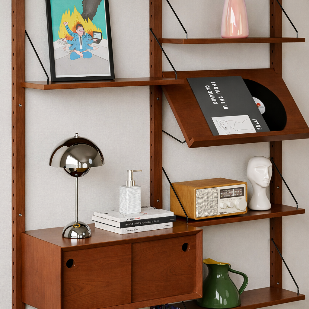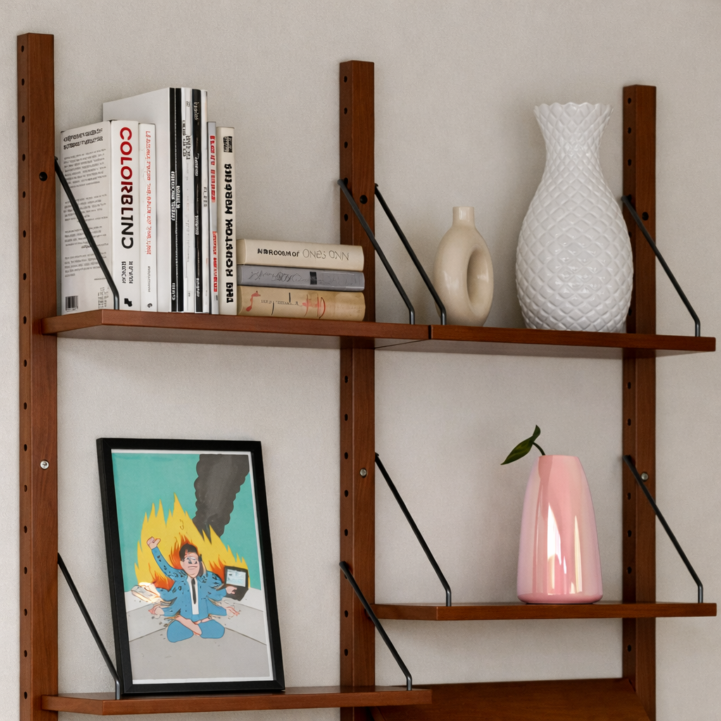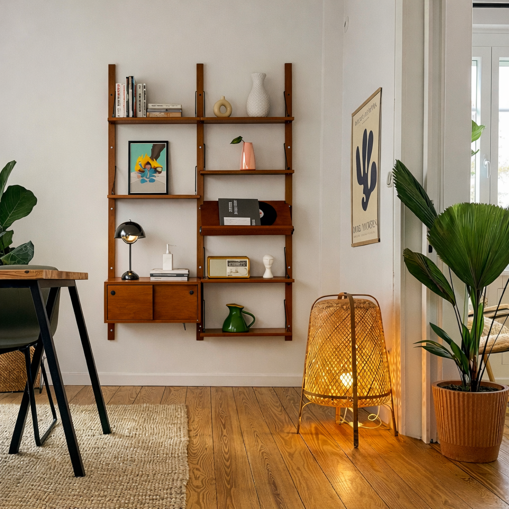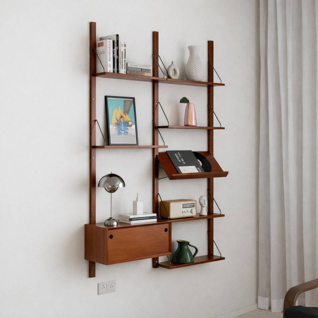 This modular-style wall shelving features a warm wood look with slim uprights and staggered shelves for a balanced, architectural feel. The lower cabinet includes enclosed compartments for paperwork, cables, or everyday clutter, pairing display space with practical organization.