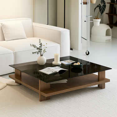 Bring sleek modern calm to your living room with our Modern Wooden Coffee Table With Glass Top For Living Room. The low, spacious design combines a dark glass surface with warm wood tones, creating a clean focal point that’s perfect for everyday lounging and quiet evenings in.