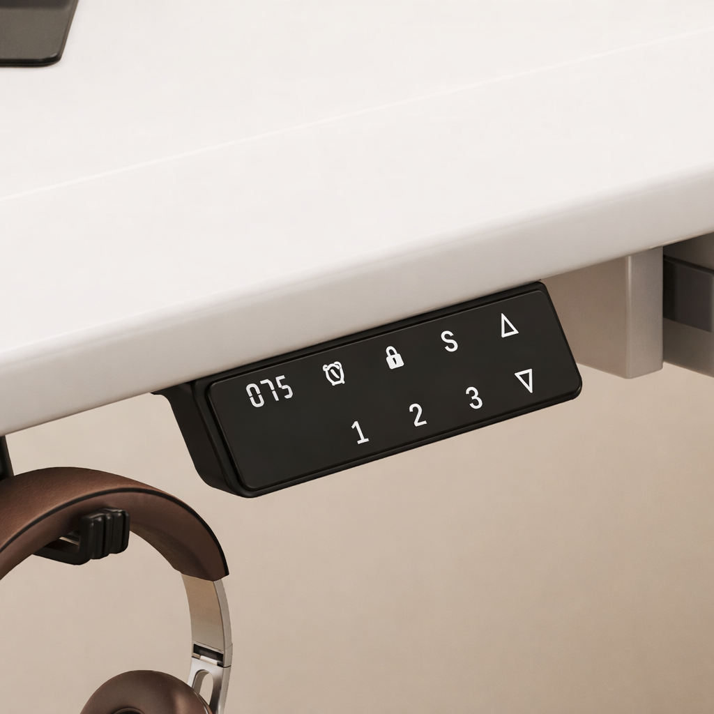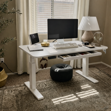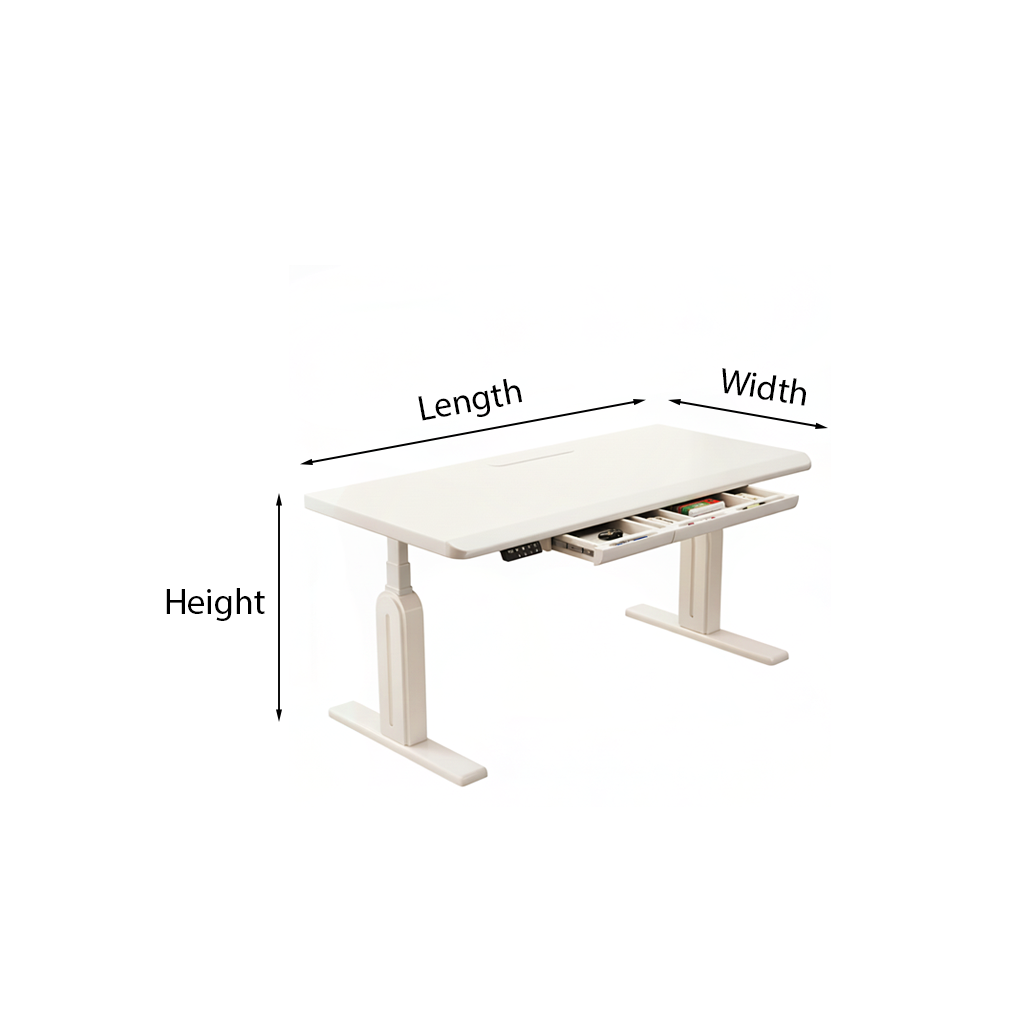 This standing desk features a spacious rectangular surface with crisp edges for a refined, contemporary profile. A built-in drawer adds convenient hidden storage for chargers, stationery, and small accessories—helping your desktop stay tidy and distraction-free.