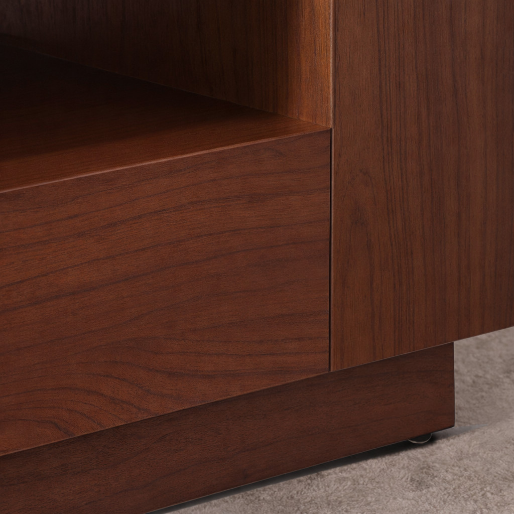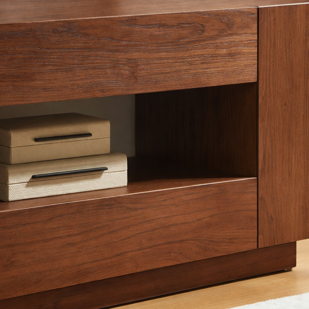 Two smooth front drawers provide closed storage for remotes, chargers, and small items you want out of sight. Below, the full-length open shelf offers easy-access space for books, baskets, or media accessories—perfect for keeping the room tidy while still feeling airy and minimal.
