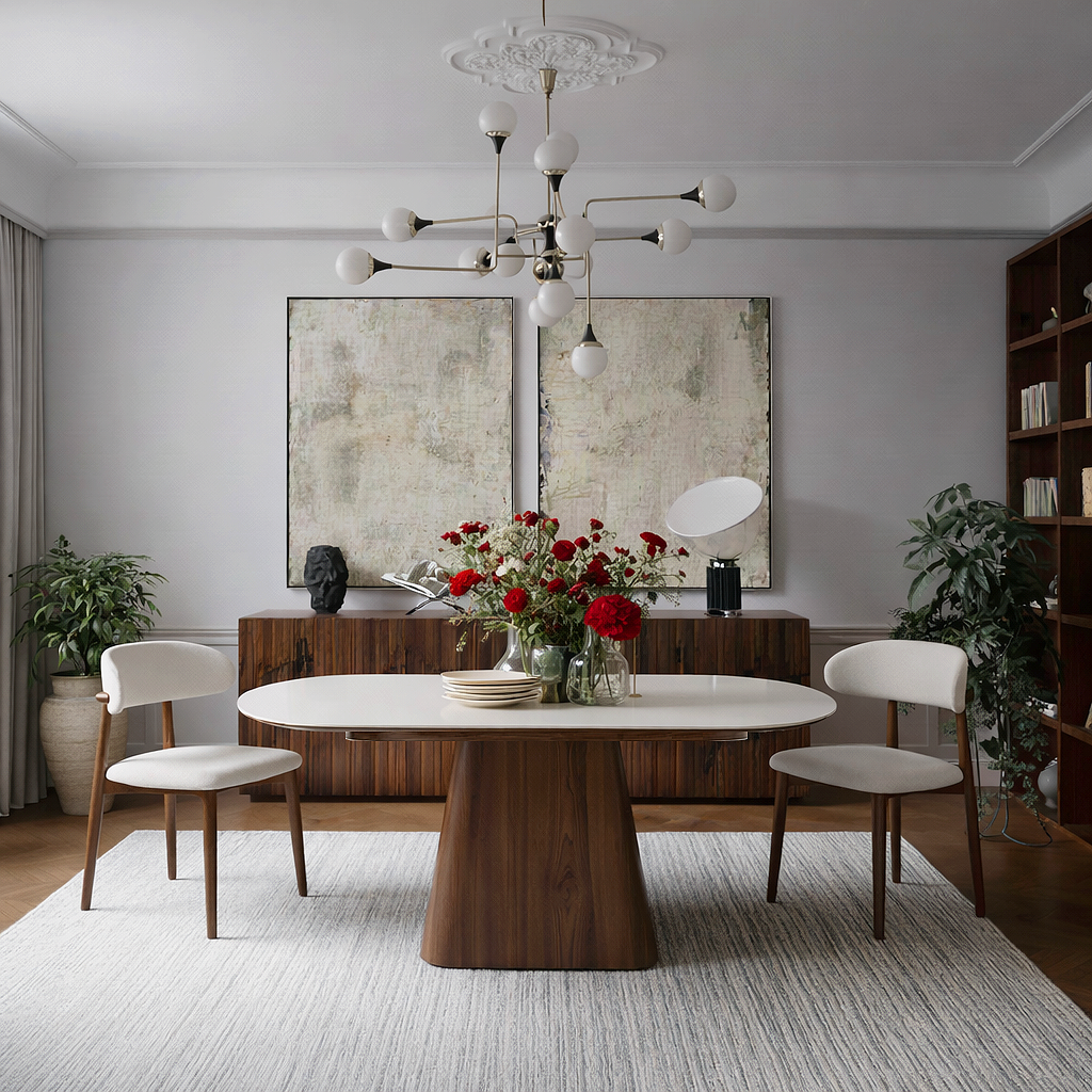 A refined oval tabletop paired with a bold, sculptural pedestal base. The rounded edges create a welcoming look and help make smaller spaces feel more open. Crafted with a smooth marble tabletop surface and a sturdy wooden pedestal base designed for daily dining.