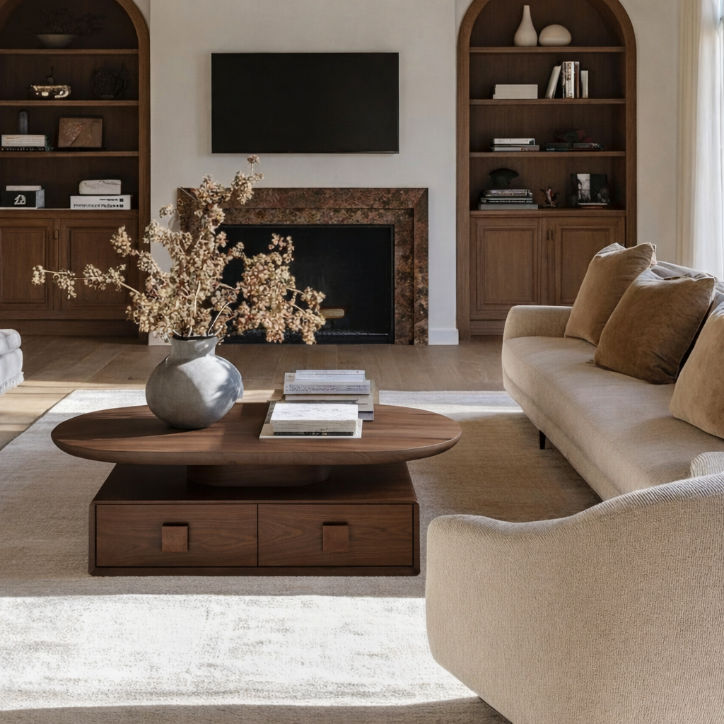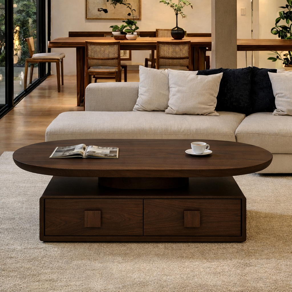 This coffee table features a spacious round tabletop with a smooth, low-profile pedestal support for a grounded, modern look. The base is designed with integrated drawers that blend into the silhouette, offering practical storage without visual clutter. Soft edges and balanced proportions help it feel substantial yet refined in the center of your seating area.