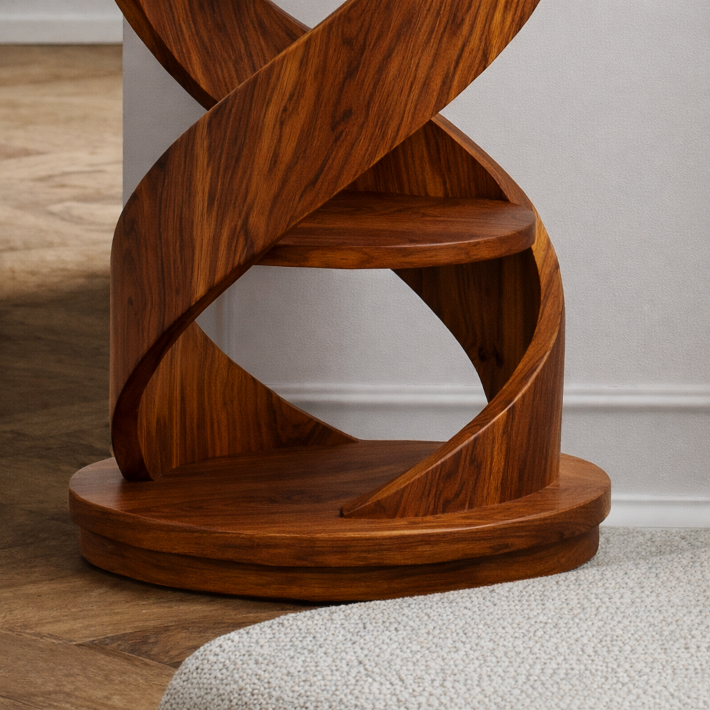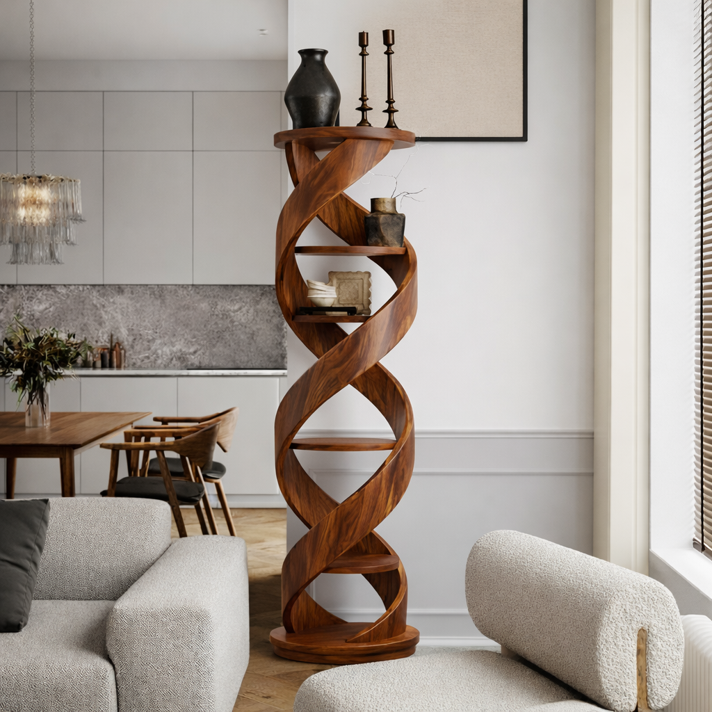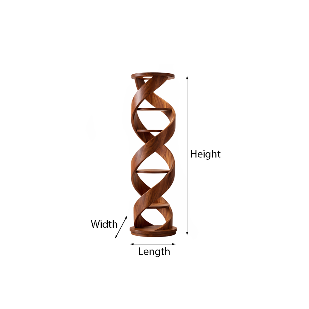A twisted helix-style frame wraps around multiple open shelves to form a vertical display tower with 360-degree appeal. The stable round base and top platform help balance the structure, while the open sides keep the piece airy and easy to style in compact workspaces.