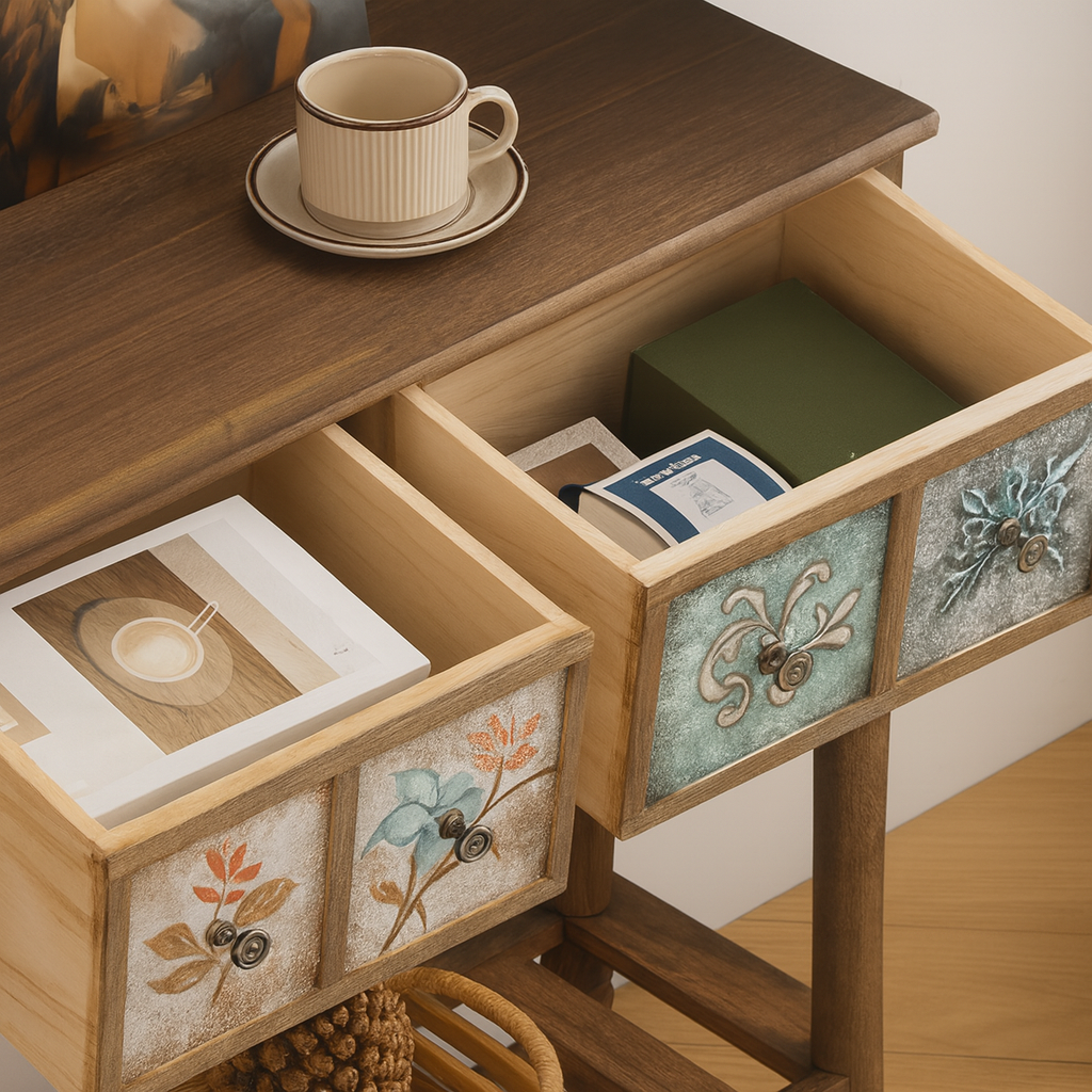 Introduce charm, character, and a touch of artistic nostalgia to your home with this vintage-inspired artistic wooden console table with floral panels. Featuring a row of decorative painted floral fronts and a warm rustic finish, this console becomes an expressive focal point in any room.